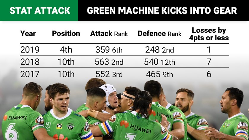 After finishing 10th in 2017 and 2018, the Raiders are on track for a top four finish this season and are just two points behind second-placed South Sydney on 24 competition points with Sydney Roosters.
