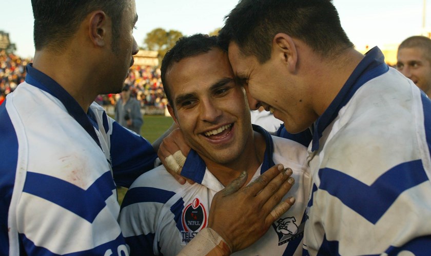 Hazem El Masri kicks a goal from the sideline to give the Bulldogs a 22-21 win over the Knights in Newcastle. The Bulldogs had trailed 19-0 before fighting back to make it 16 straight wins.