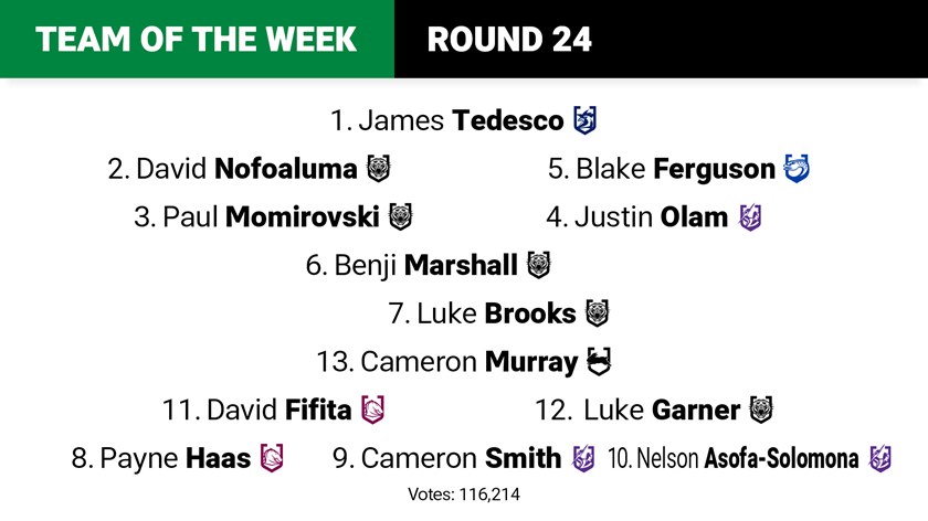With their season on the line the Wests Tigers stood tall at the SCG on Sunday and their dominant win over the Dragons catapulted Benji Marshall and four of his team-mates into the Team of the Week for round 24.