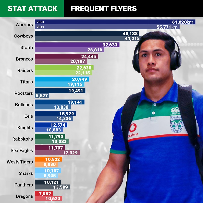 An analysis of the total distance travelled by every team in the 2020 draw reveals a significantly increased travel toll for premiers the Roosters, while the loads on travel-heavy sides Melbourne and the Warriors bounce back after drop-offs in 2019.