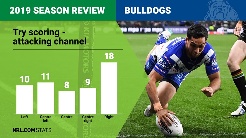 The Bulldogs favoured their right edge over the left side in try-scoring measures with a combined 27 for the season.