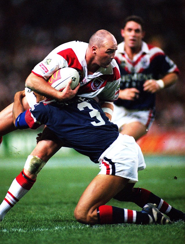 St George Illawarra centre Paul McGregor makes his comeback to rugby league after a 16-month lay-off in the Dragons’ 36-12 trial game win over the Sydney Roosters at WIN Stadium. McGregor captained the Dragons in the 1999 grand final but then a shoulder reconstruction wiped out his entire 2000 season. He retired at the end of 2001.