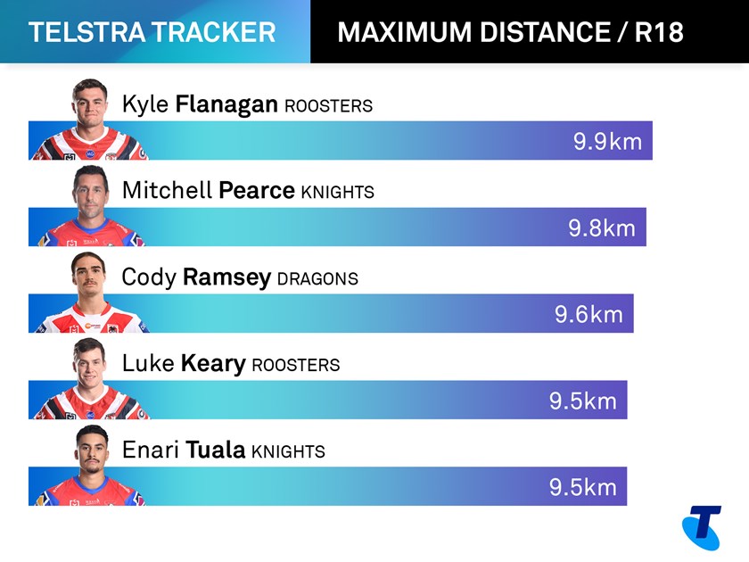 Keary's halves partner Kyle Flanagan covered the most distance with 9.9km in a win over Newcastle, edging their No.7 Mitchell Pearce (9.8).