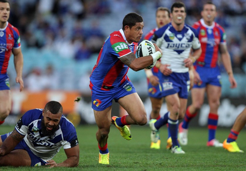 Dane Gagai attacks for Newcastle against Canterbury during the 2013 finals.