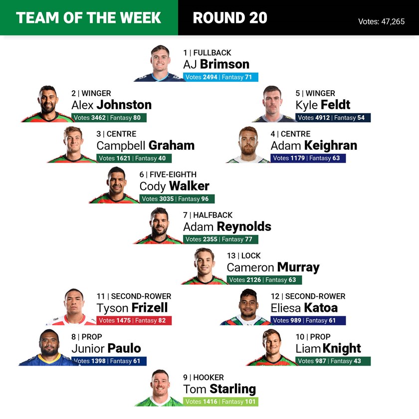 The Rabbitohs turned the competition on its head with a stunning rout of the Roosters in round 20 and fans voted six of Wayne Bennett's men into the team of the week as a result.