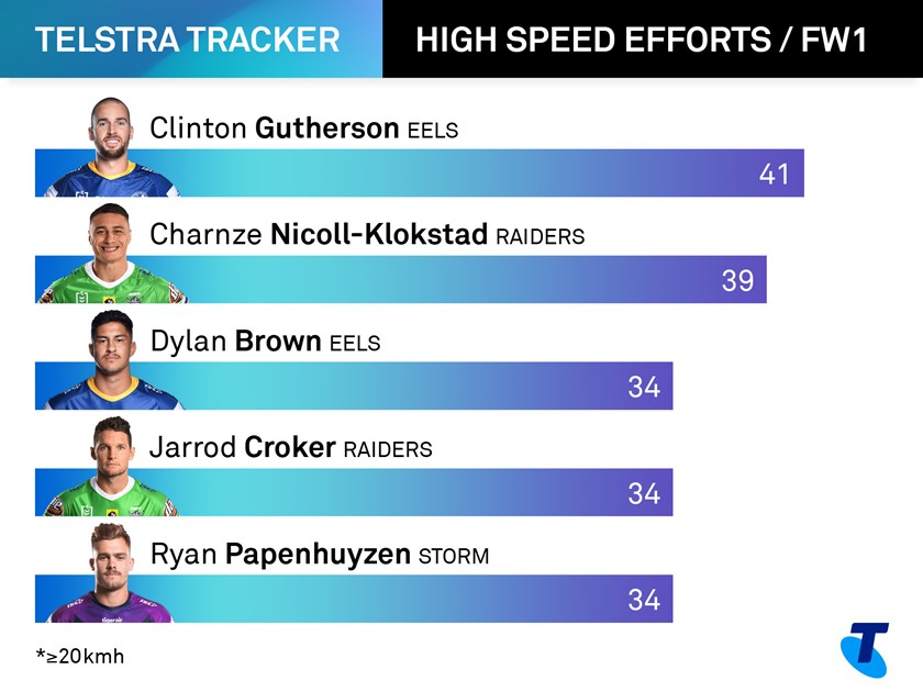 Eels captain Gutherson, meanwhile, has been a staple of the weekly top five for high-speed efforts (bursts of 20km/h or more) and his total of 41 was four off the season record which he jointly owns.