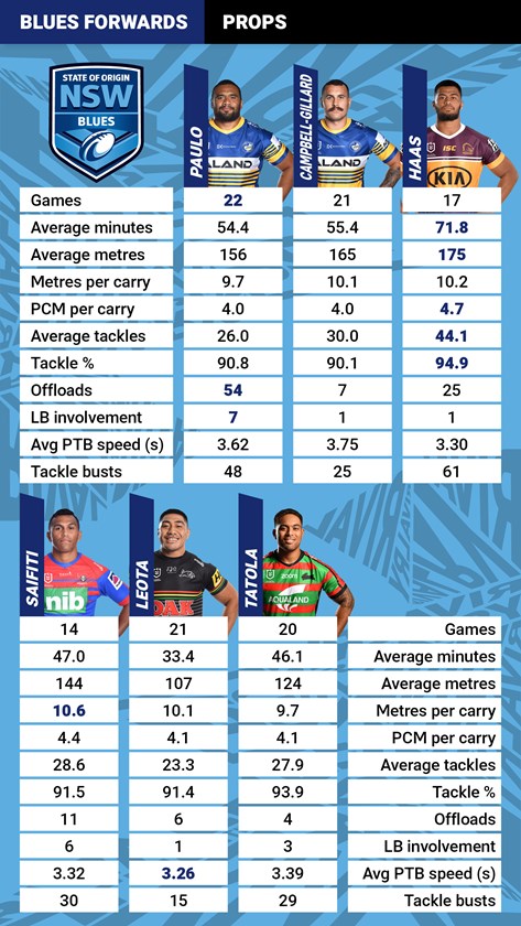 It makes Paulo an interesting case and a near certain selection. He has seven line-break assists – none of the other eligible props have more than one (Saifiti's impressive numbers are individual breaks rather than assists) while Paulo has more than double the offloads of any other candidate and his 48 busts make him the only prop other than Haas (61) to register anything of interest in that category.
