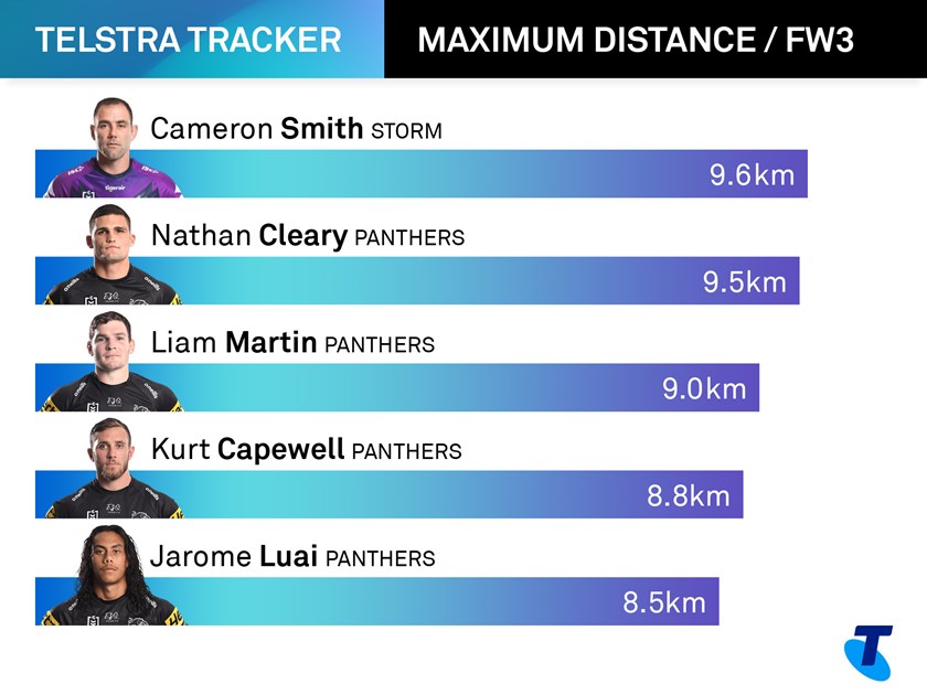 But the Panthers are well on top in the maximum distance category thanks to halfback Nathan Cleary, whose personal-best of 10.3km in a match was easily the most between the teams.