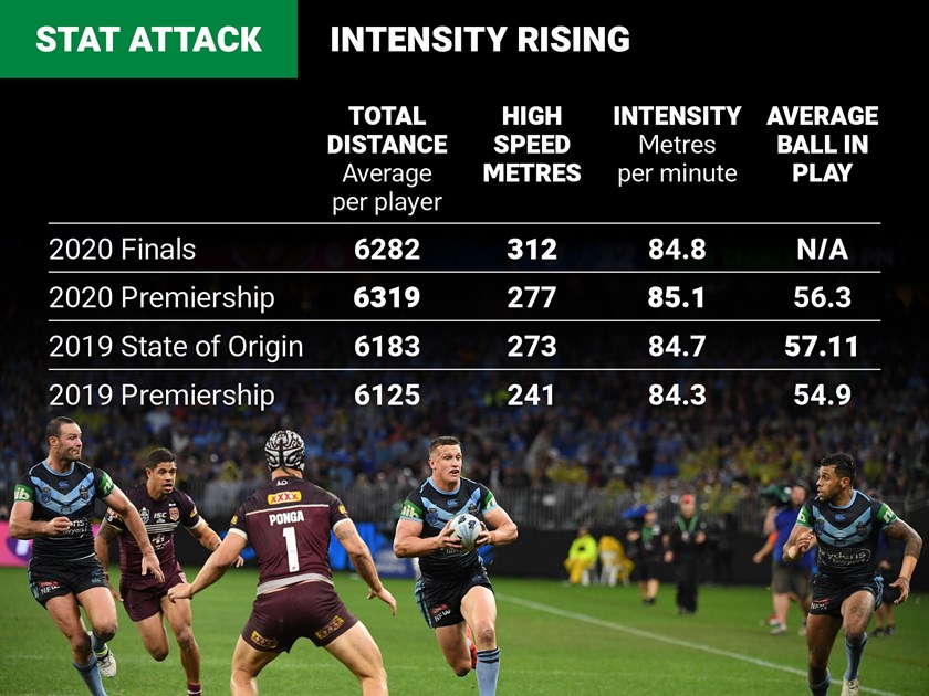 Intensity, which is measured by metres per minute, and the total distance run by players in NRL matches were also significantly higher than last season and greater than the 2019 Origin series.