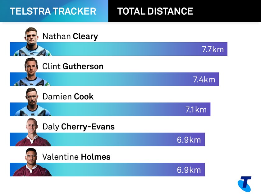 While the game two man-of-the-match didn't register as many metres across the 80 minutes given the Blues' performance on Wednesday night, Cleary's 7.7 kilometres covered topped the charts for a second Origin game in a row.
