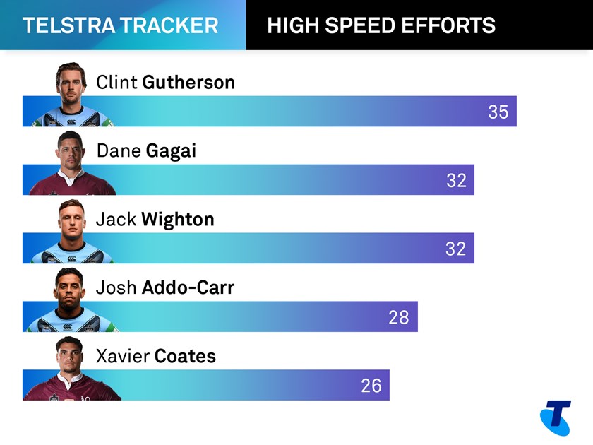 Gutherson topped the high-speed efforts (efforts over 20km/h) with 35 for the match as the centres dug in for their teammates with centre partner Jack Wighton and Maroons nemesis Dane Gagai each finishing on 32.