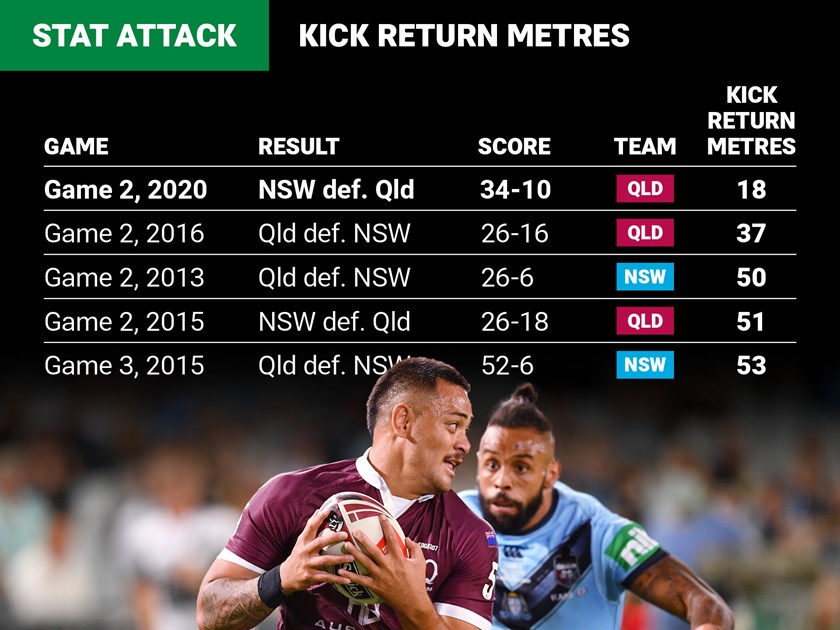 Since thorough run metre measurements were first recorded in 2004, never in an Origin match has a side finished with as few as the 18 kick return metres Queensland recorded in their 34-10 loss on Wednesday.