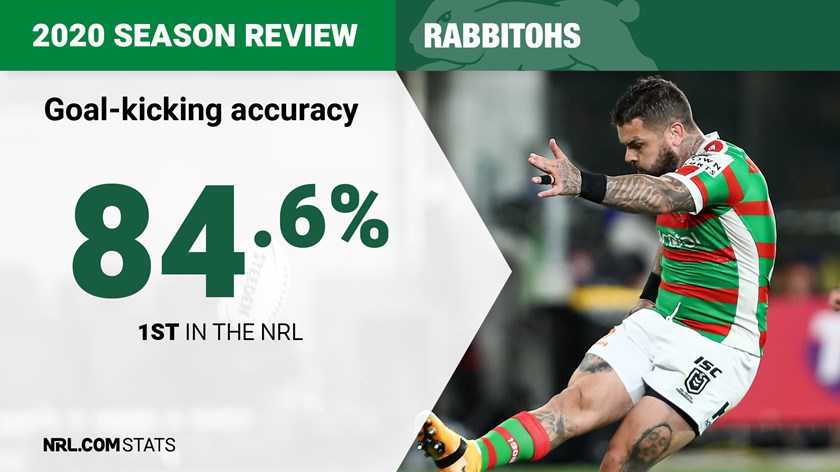 Thanks to Adam Reynolds's deadly right boot, South Sydney's score usually went up in sixes. The team boasted the league-best goal-kicking success rate of 84.6 percent (88 goals from 104 attempts).