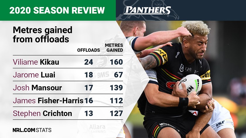 The most prolific source of second-phase play at the Panthers was Viliame Kikau, with 160 metres gained from his 24 offloads across the season, while backline trio Jarome Luai, Josh Mansour and Stephen Crichton also impressed along with the always busy James Fisher-Harris.
