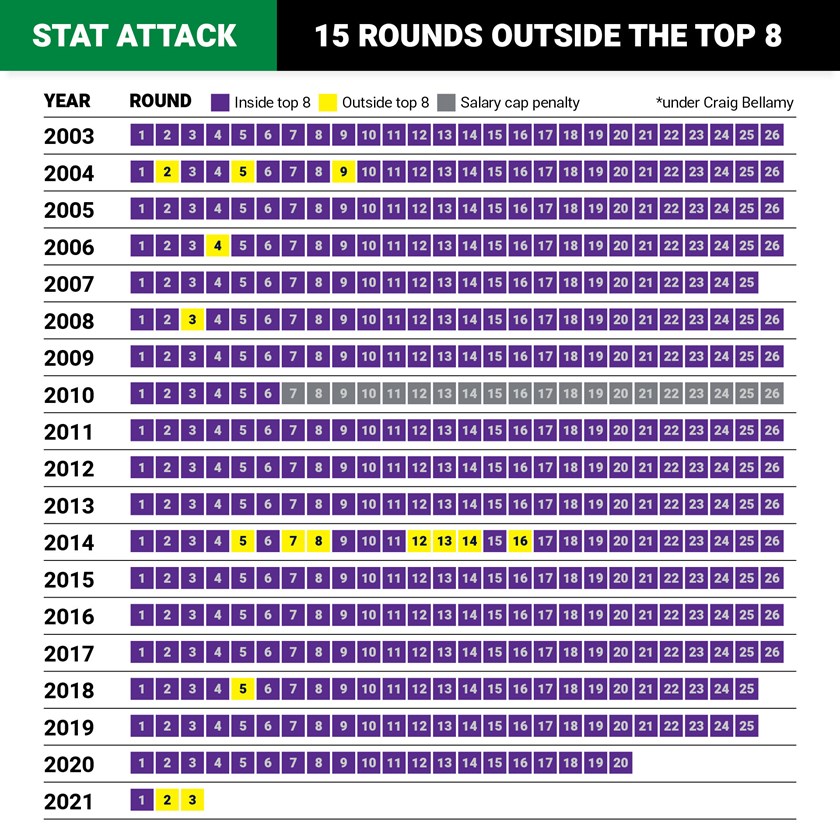 Having slipped to ninth after the loss to the Eels in round two, the 11th-placed Storm are outside the top eight in back-to-back weeks for the first time since 2014 when they spent three consecutive weeks – rounds 12, 13 and 14 – outside the finals zone.