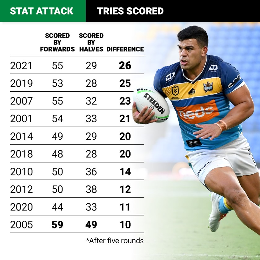 The try differential between forwards over halves is the biggest it's ever been after five rounds of the NRL era.