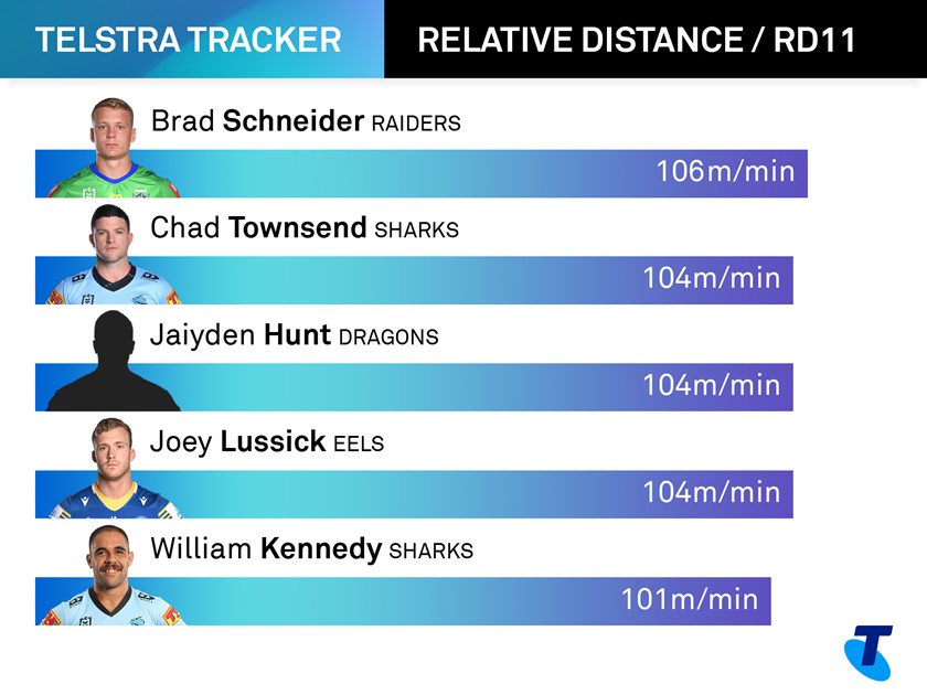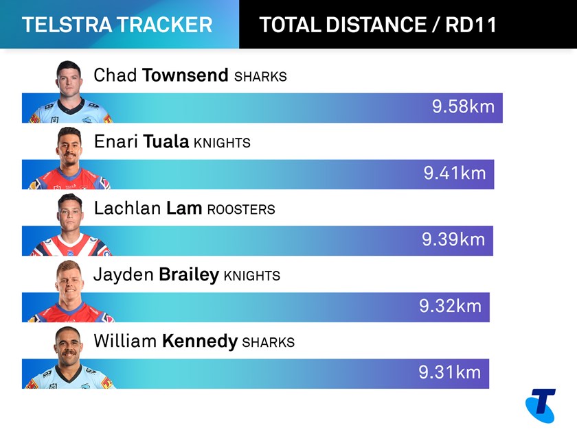 Townsend ran 9.58km, with Knights back Enari Tuala next (9.41km). Sharks fullback Will Kennedy (9.31km) ranked fifth.