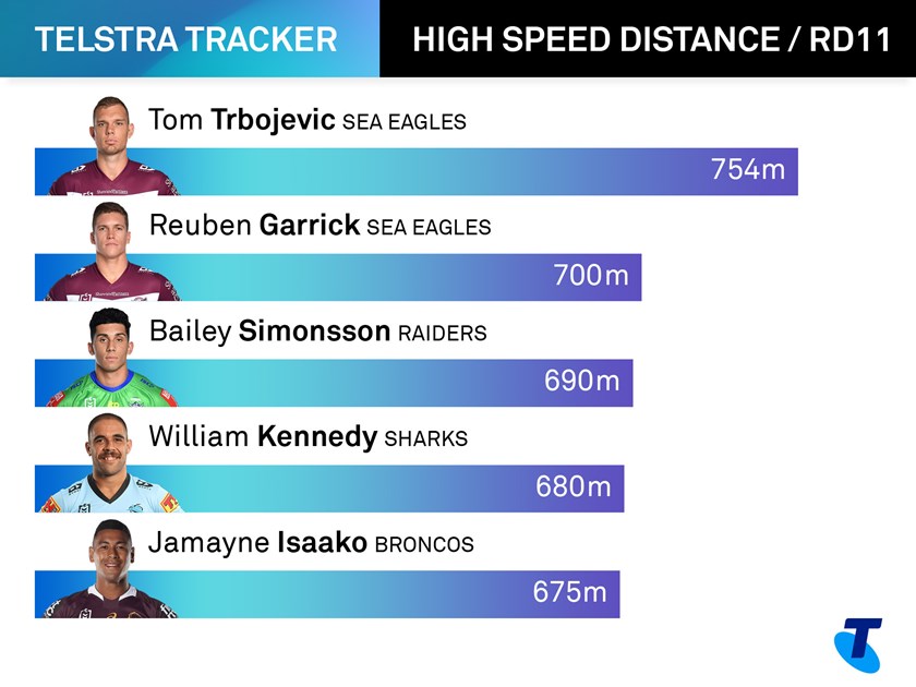 Meanwhile, Tom Trbojevic's sizzling form continues to translate to big Telstra Tracker numbers with the Sea Eagles fullback again topping the high-speed (20km/h or more) distance category.
