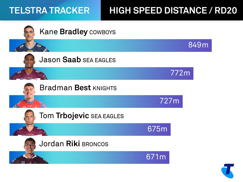 Only rookie Cowboys winger Kane Bradley, who pushed through a broken hand to record a round-high 849 high-speed metres, and Manly flyer Jason Saab (772hsm) ranked higher than Best.