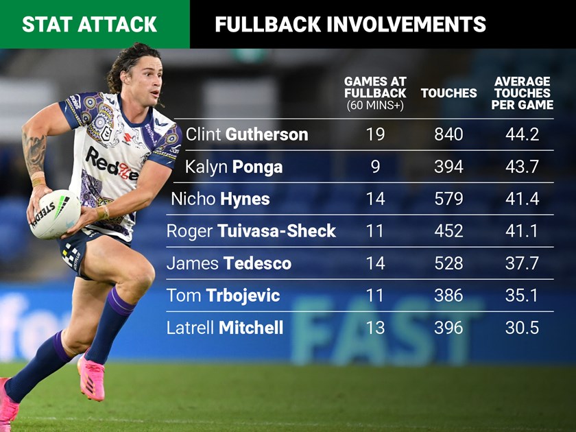 Of the NRL's top tier of fullbacks, only Clint Gutherson (44.2 touches per game) and Kalyn Ponga (43.7 touches per game), get their hands on the ball more than Hynes has when lining up at fullback this year.