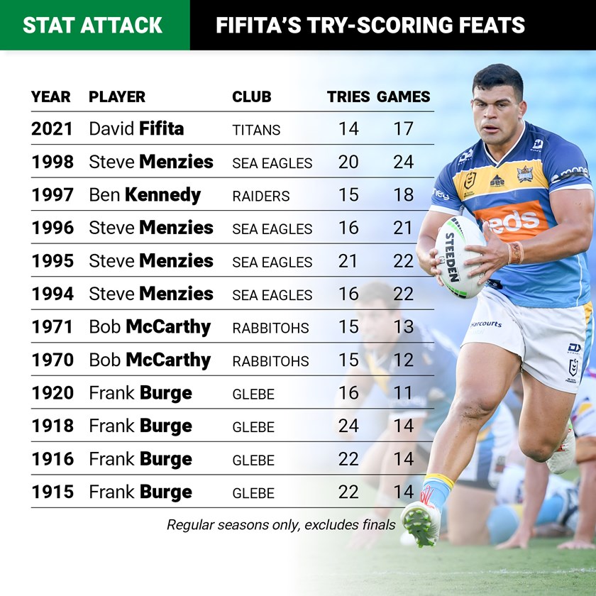 Titans powerhouse David Fifita needs one more try to join an incredibly elite group of try-scoring forwards.