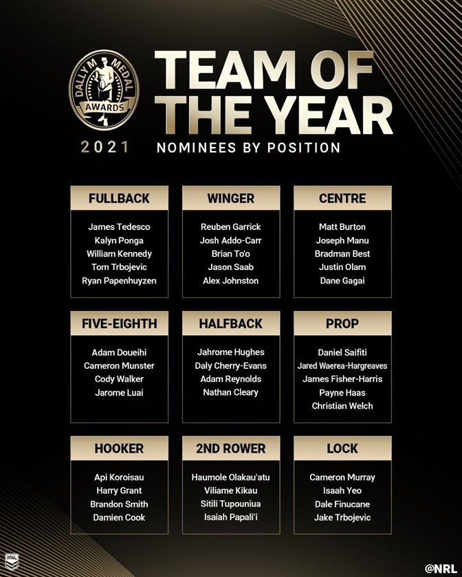 The members of the Team of the Year will be announced as part of the Dally M Awards ceremony on Monday night at the Rivershed at Brisbane's Howard Smith Wharves.