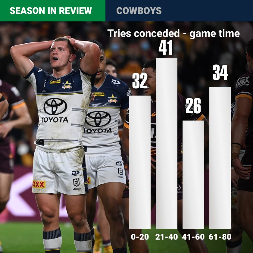 While the Cowboys had the ability to score tries early, they were rated the worst in the competition for tries conceded in the first half of games with 73.