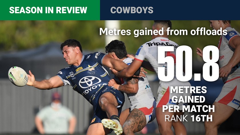 No Cowboys player finished in the NRL's top 50 for offloads with Jason Taumalolo the side's best with 17, followed by Scott Drinkwater (15), Coen Hess (11) and Valentine Holmes (11).