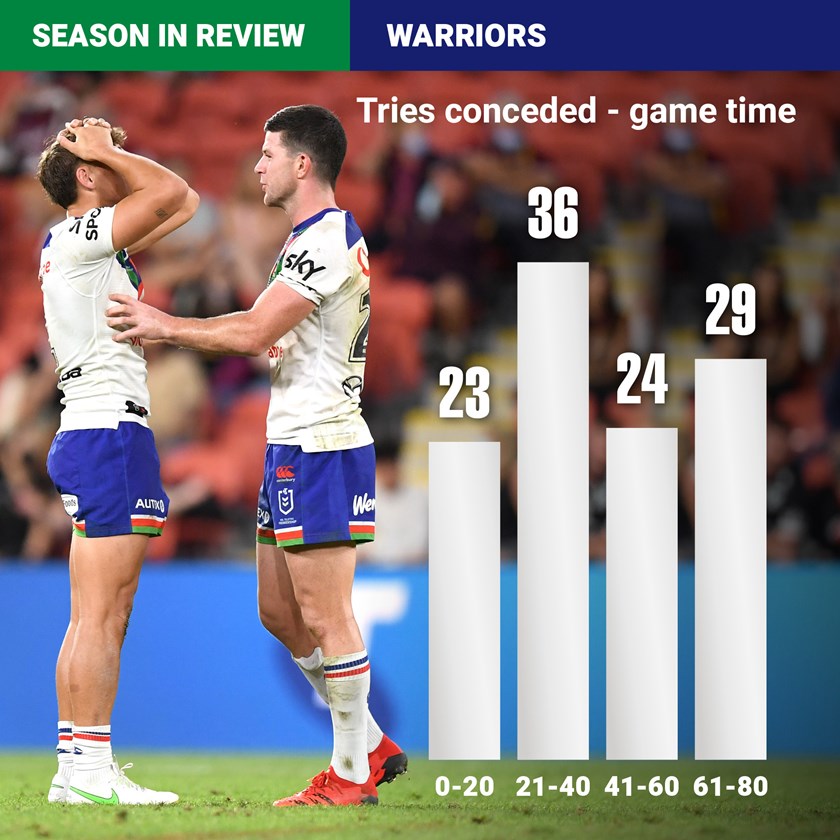 Part of that is around their attack but a much more significant component is their defence, with the Warriors leaking far more tries in the second 20 minutes of each half.