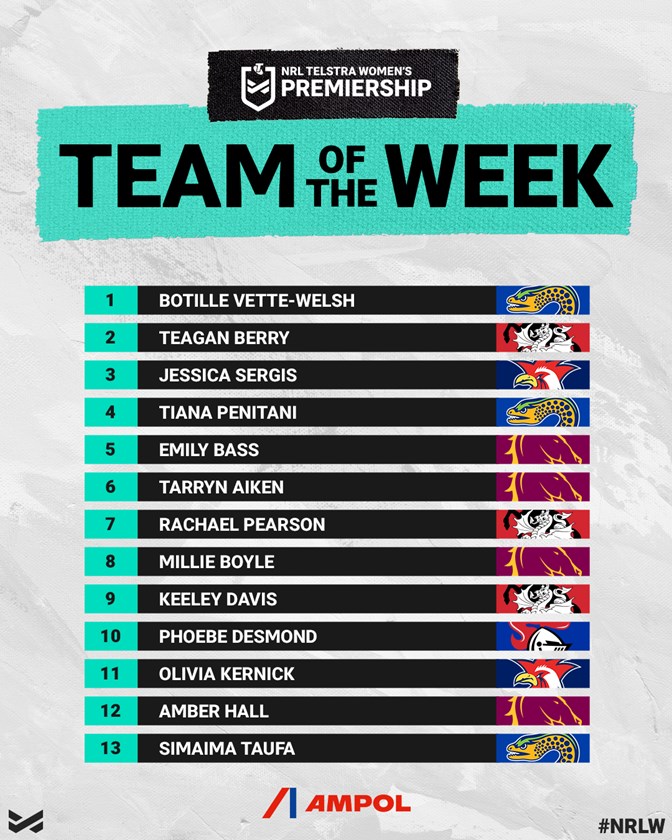 Parramatta's custodian was at her influential best to pip a classy field of fullbacks for team of the week honours in round one. Vette-Welsh finished the side's 13-12 win with two line breaks, a try assist and 178 metres.