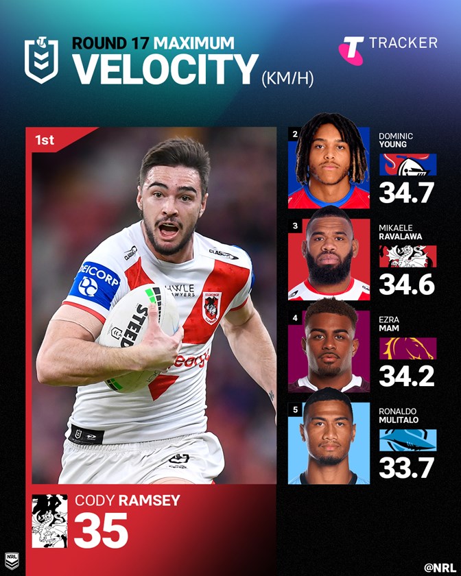 The Dragons featured heavily in the Round 17 data overall, with powerhouse wing Mikaele Ravalawa clocking the third highest speed of the weekend (34.6km/h) and Jack Bird registering 203 metres of sprinting at a speed of more than 25 km/h.