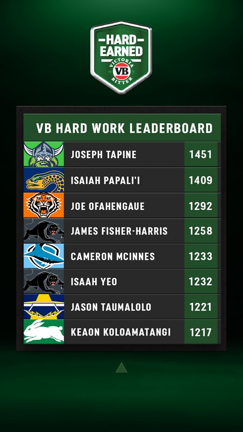 Tapine, who produced 13 tackle busts plus 13 carries for more than eight metres in the Raiders' win against the Titans, topped the Index for the second week in a row and he now has a 42-point lead at the top of the overall leaderboard.