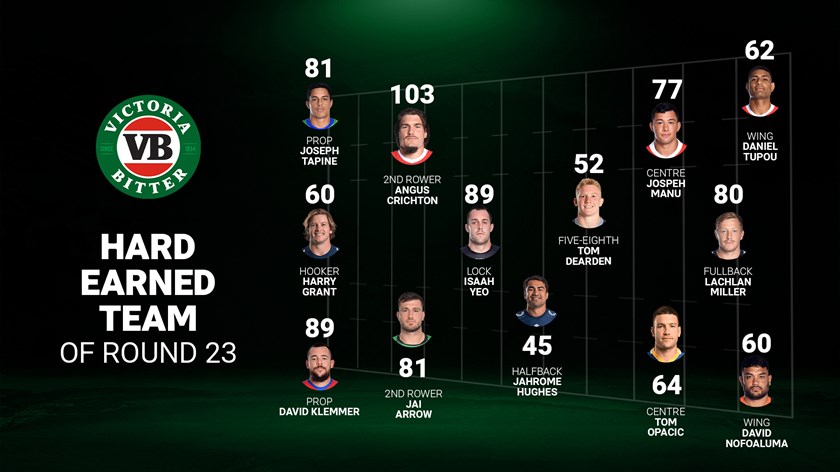Roosters back-rower Angus Crichton's tireless running in Saturday night's 72-6 drubbing of the Wests Tigers saw him top the VB Hard Earned Index for round 24, with both the effectiveness and sheer volume of his work standing out.
