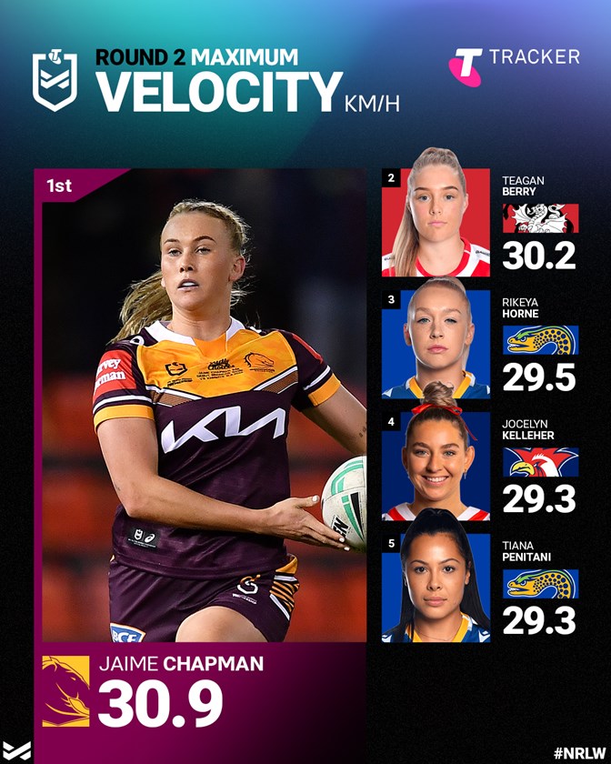 In round 2 of the NRLW it was Brisbane back Jaime Chapman who registered the highest speed of the weekend at 30.9 km/h, as she put in an impressive performance in her side's loss to the Roosters.