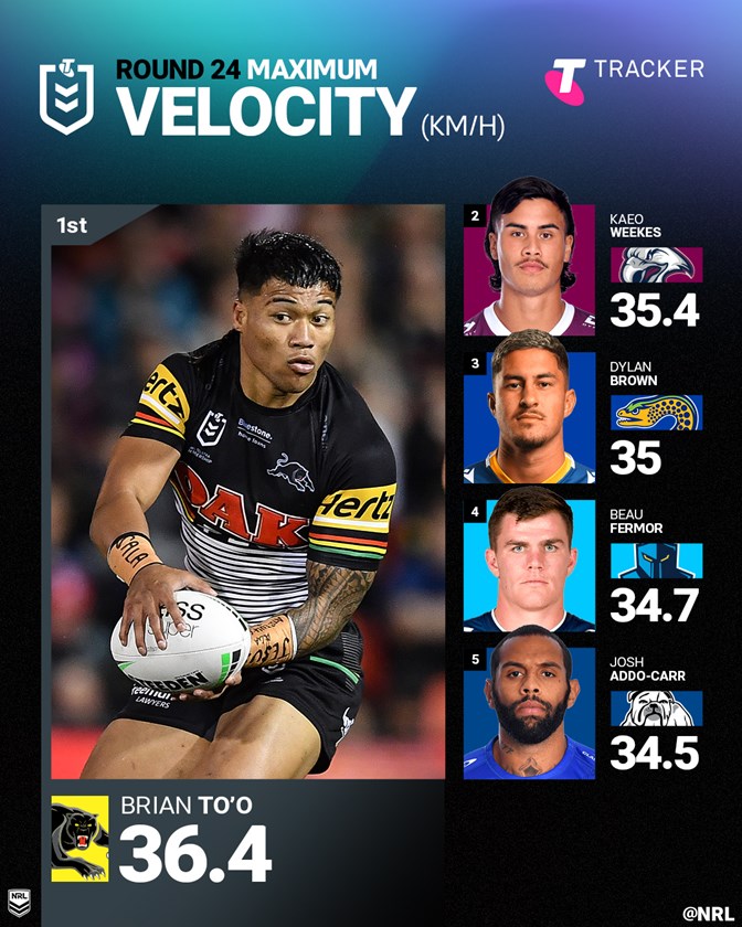 Panthers powerhouse Brian To'o was the pick of the NRL  speedsters for round 24, clocking a maximum velocity of 36.4 kilometres per hour on the Telstra Tracker in his side's victory over the Warriors.