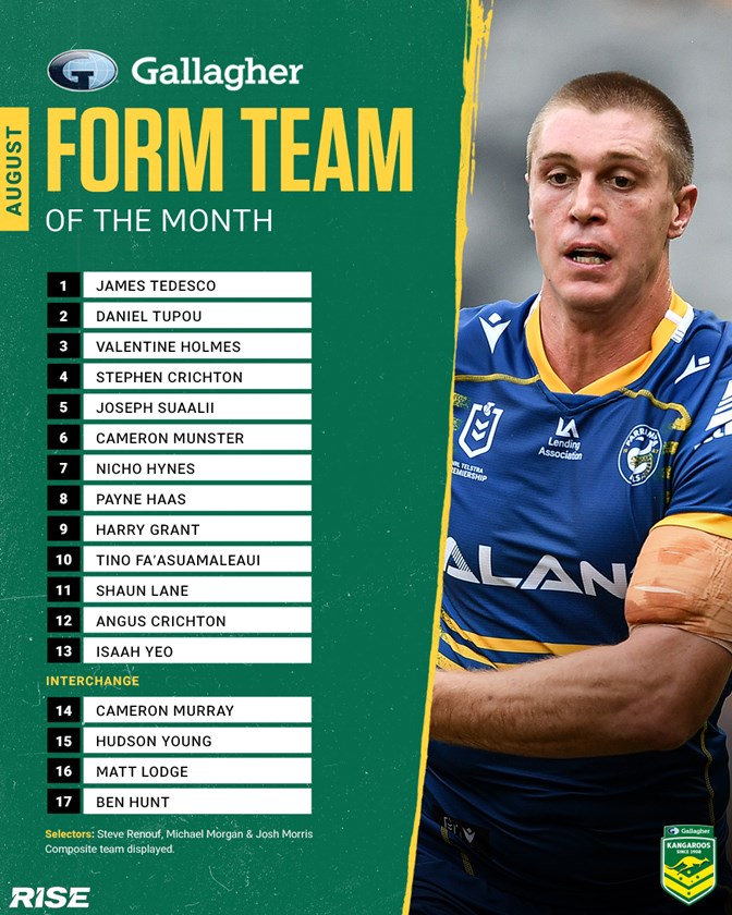 Try-scoring freak Alex Johnston earns selection opposite Roosters young gun Joseph Suaalii on the wings, while Nicho Hynes gets the nod in Morgan's halves alongside Cameron Munster. There's a pair of Cowboys in the forward pack, with Reece Robson and Jeremiah Nanai continuing their breakout seasons as North Queensland push towards the finals series, while Raiders edge Hudson Young also earns a spot after ending the year in try-scoring form. Harry Grant joins the Roosters pair Angus Crichton and Victor Radley on the bench alongside Cameron Murray, the latter of whom was a popular selection across all teams this month.