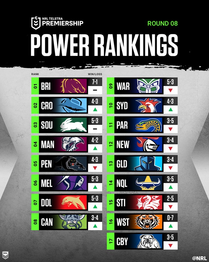 Cronulla have moved into second on the NRL Power Rankings after recording back-to-back wins against the Roosters and Bulldogs but it's Brisbane who continue to lead the way heading into Round 9.