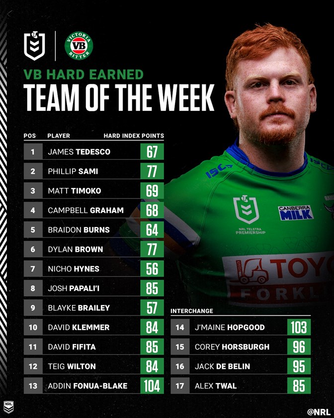 Meanwhile, the Raiders' thrilling golden-point victory over the Dolphins saw three of their stars feature in the Team of the Week with Corey Horsburgh (96 points) putting his hand up for 20 carries and 30 tackles at lock.