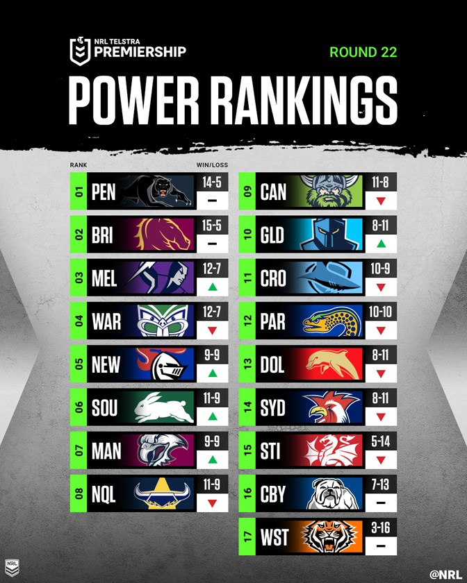 The Titans meanwhile have gone up five spots in the rankings to 10th after a nine-point win over the Cowboys, who in suffering their first loss since the end of May have dropped down three spots to sit eighth, the same spot they occupy on the actual ladder.