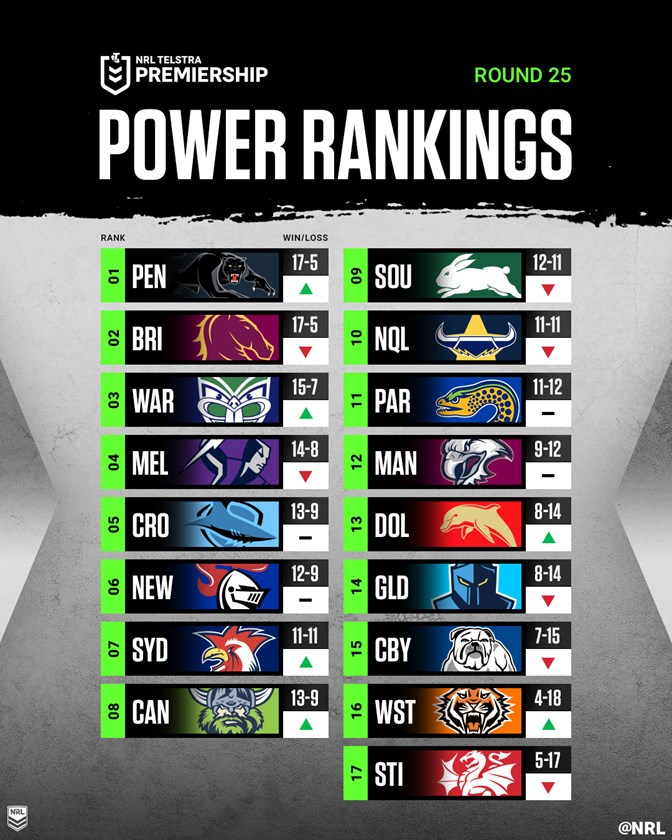Meanwhile, the Raiders' big win over the Bulldogs saw them jump two places into eighth in the rankings and hang on to sixth position on the competition ladder.