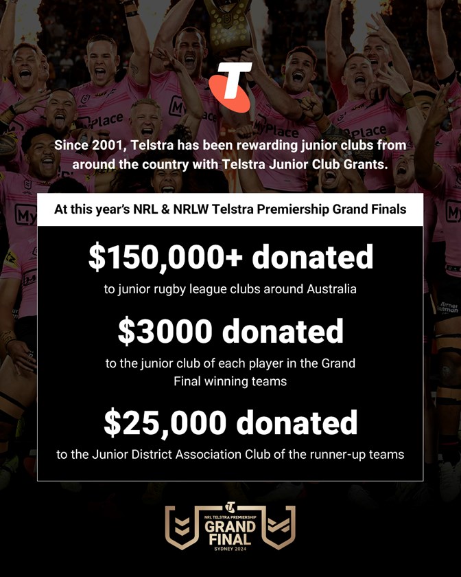 Since 2001, Telstra has been rewarding junior clubs from around the country with Telstra Junior Club Grants and this year during the post-match presentation of both NRL Telstra Men’s and Women's Premierships, Telstra awarded more than $150,000 to junior rugby league clubs.
