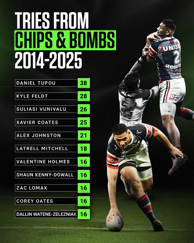 The Roosters veteran has scored 38 tries from chips and bombs since 2014, 10 clear of former Cowboys winger Kyle Feldt.