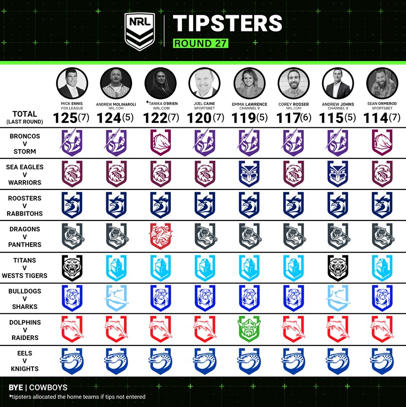 Our panel of expert tipsters are here to offer up their take on the games ahead in Round 27 of the NRL Telstra Premiership and Round 10 of the NRL Telstra Women's Premiership.