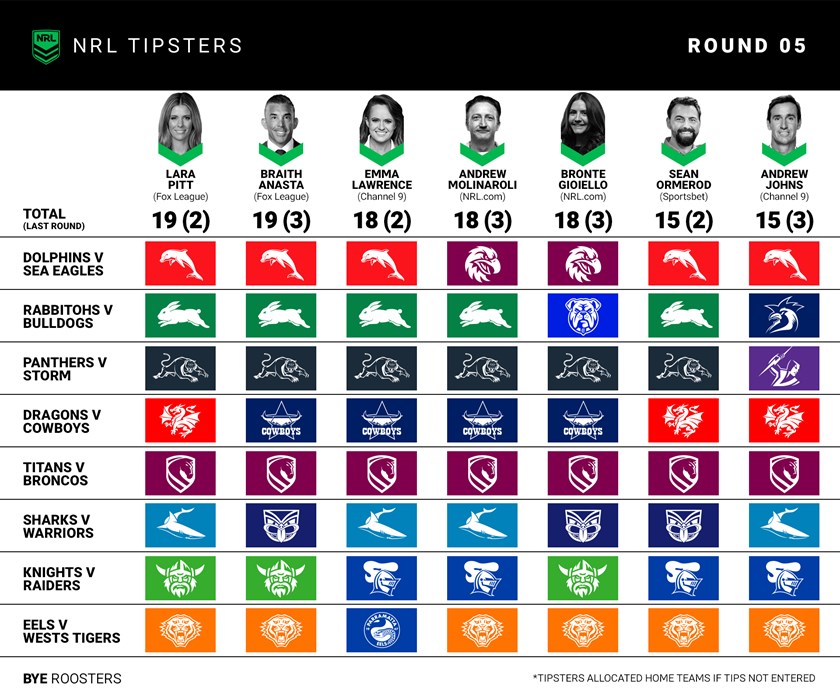 Round 5 of the 2026 NRL Telstra Premiership is here and after a weekend of upsets it's only getting tougher to tip which team will get the two points in any given contest.