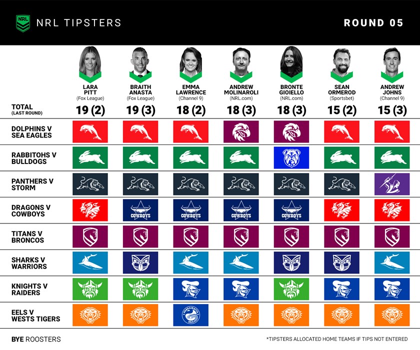 Round 5 of the 2026 NRL Telstra Premiership is here and after a weekend of upsets it's only getting tougher to tip which team will get the two points in any given contest.