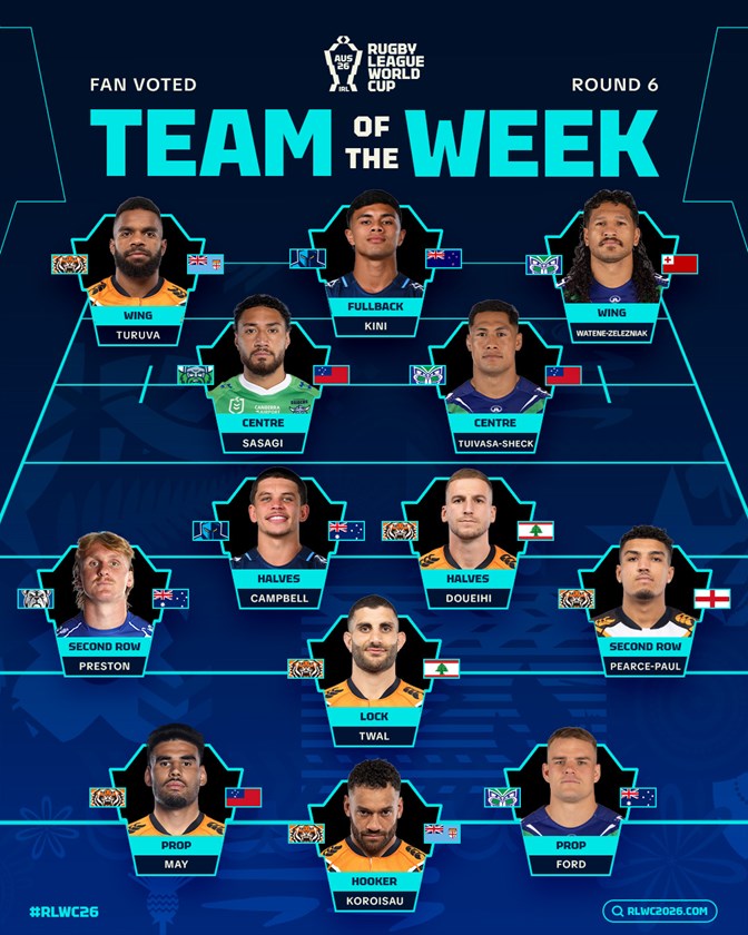 Each week, fans vote for their RLWC2026 Team of the Week from players nominated after the previous weekend's NRL and Super League matches, who are eligible for the 10 nations contesting Rugby League World Cup 2026.