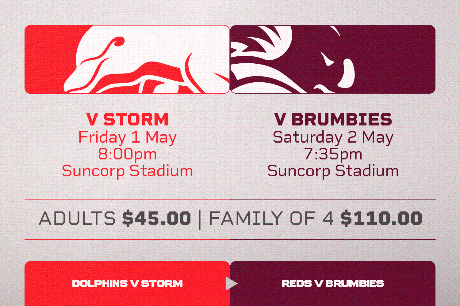 The best part? You can be there for both. Fans can secure a ticket for just $45 for adults or $110 for a family of four, granting entry to both the Dolphins clash on Friday, May 1 at 8:00pm, and the Reds showdown at 7:35pm the following night, two nights of elite sport, one unbeatable price.